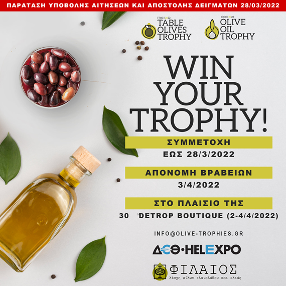 Παρατείνεται έως τις 28 Μαρτίου 2022 η ημερομηνία υποβολής αιτήσεων και αποστολής δειγμάτων για τους δύο Διεθνείς Διαγωνισμούς των OLIVE TROPHIES και ειδικότερα για τον Διεθνή Διαγωνισμό Ποιότητας Επιτραπέζιων ελιών «TABLE OLIVES TROPHY» και τον Διεθνή Διαγωνισμό Ποιότητας Εξαιρετικών Ελαιολάδων «OLIVE OIL TROPHY».