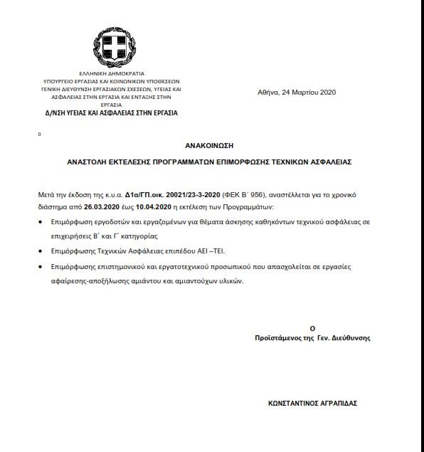 Μετά την έκδοση της κ.υ.α. Δ1α/ΓΠ.οικ. 20021/23-3-2020 (ΦΕΚ Β΄ 956), αναστέλλεται για το χρονικό διάστημα από 26.03.2020 έως 10.04.2020 η εκτέλεση των Προγραμμάτων: