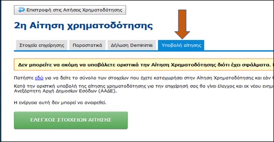 Προσοχή: Εάν δεν εκτελέσετε την επιλογή της οριστικής υποβολής της αίτησης χρηματοδότησης εντός της προβλεπόμενης προθεσμίας,