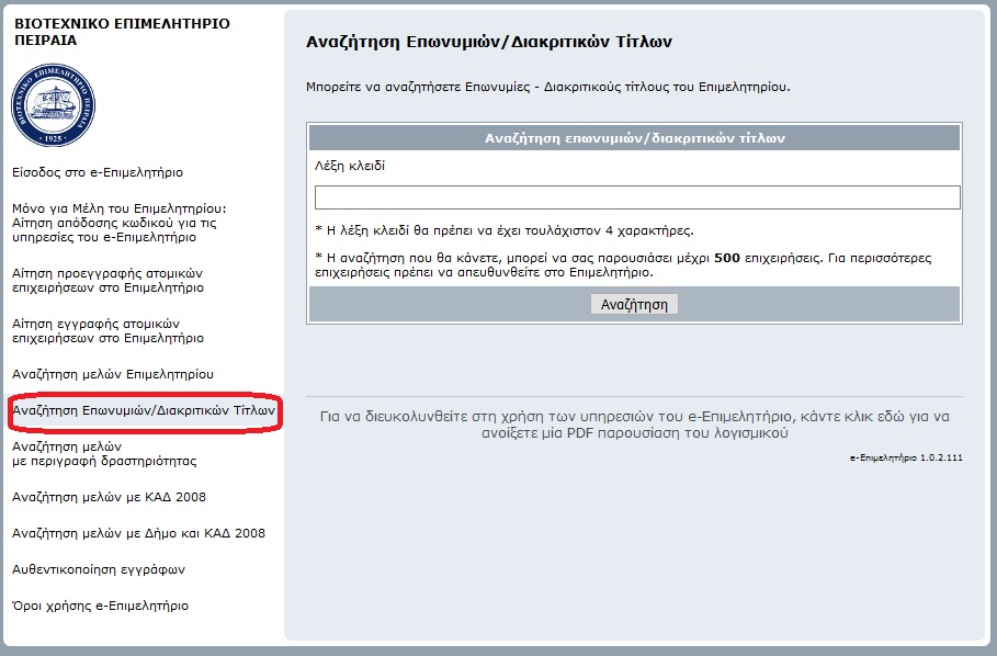 Οι επιχειρήσεις μέλη του Bιοτεχνικού Επιμελητηρίου Πειραιά μπορούν να αναζητητούν εταιρείες - μέλη του Επιμελητηρίου με βάση την Επωνυμία ή τον Διακριτικό τους τίτλο στο e - Επιμελητήριο.