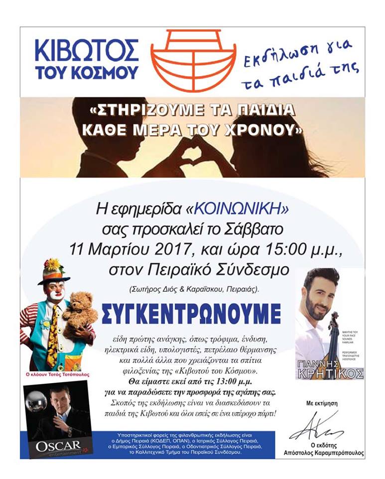 Το Βιοτεχνικό Επιμελητήριο Πειραιά στηρίζει την πρωτοβουλία της εφημερίδας «ΚΟΙΝΩΝΙΚΗ», με 51 χρόνια καθημερινής παρουσίας στον ενημερωτικό «στίβο» της Αττικής, να αναδείξει μια διαφορετική αντίληψη για το ρόλο του Τύπου και γενικότερα των ΜΜΕ, διοργανώνοντας μια ξεχωριστή φιλανθρωπική εκδήλωση για τα παιδιά της «ΚΙΒΩΤΟΥ ΤΟΥ ΚΟΣΜΟΥ».