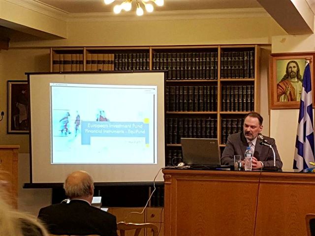 Ο κος Γεώργιος Γιακουμάκης, εκπροσωπώντας το Ευρωπαϊκό Ταμείο Επενδύσεων, επεσήμανε τον ρόλο του Ευρωπαϊκού Ταμείου Επενδύσεων για την υποστήριξη μικρομεσαίων επιχειρήσεων με τη χρηματοδότηση σχεδίων που συμβάλλουν στην επίτευξη των στόχων της ΕΕ και παράλληλα παρουσίασε αναλυτικά την πρωτοβουλία EquiFund (Ταμείου Επιχειρηματικών Συμμετοχών), που αποτελεί μια επενδυτική πλατφόρμα συνδυασμού χρηματοδότησης και εμπειρίας από σημαντικούς θεσμικούς φορείς και απαραίτητη ευελιξία για την δημιουργία επιτυχημένων επενδύσεων.