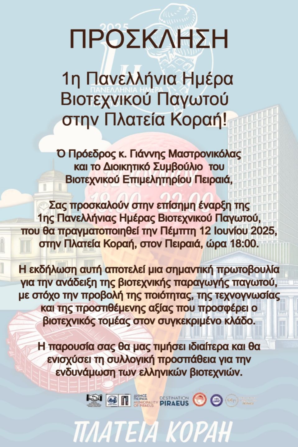 ΠΡΟΣΚΛΗΣΗ «ΠΑΝΕΛΛΗΝΙΑ ΗΜΕΡΑ ΒΙΟΤΕΧΝΙΚΟΥ ΠΑΓΩΤΟΥ» ΣΤΟΝ ΠΕΙΡΑΙΑ