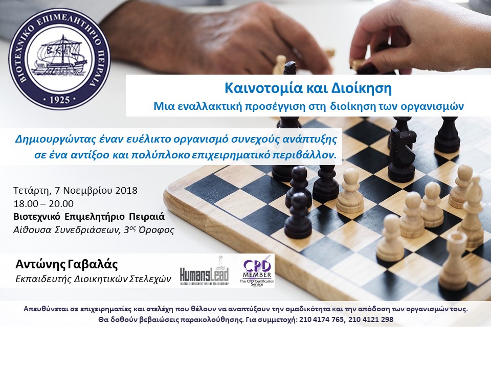 Το Βιοτεχνικό Επιμελητήριο Πειραιά σας προσκαλεί στο δίωρο διαδραστικό σεμινάριο «Καινοτομία και Διοίκηση», που θα γίνει σε συνεργασία με τον εκπαιδευτή Αντώνη Γαβαλά, καθηγητή ηγεσίας και μέλος του ‘The CPD Certification Service’. Σκοπός της συνάντησης είναι να συζητηθούν κοινά προβλήματα διοίκησης και συνεργασίας των ανθρώπων και να εξετασθεί μια διαφορετική και καινοτόμα διοικητική προσέγγιση.