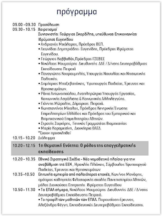 | 11.15-11.30 | Επιτυχής εμπειρία από παλαιότερες εποχές, Εκπρόσωπος Ιδρύματος Ευγενίδου |