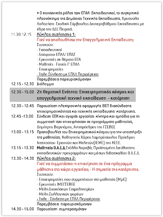 | 13.30 – 15.30 | 2η Θεματική Ενότητα: Επιχειρηματικός κόσμος και τεχνική εκπαίδευση - κατάρτιση |