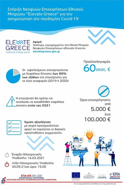 Η Δράση στοχεύει στην ενίσχυση της επιχειρηματικότητας και της ρευστότητας των νεοφυών/καινοτόμων μικρομεσαίων επιχειρήσεων (που δραστηριοποιούνται σε τομείς της Έξυπνης Εξειδίκευσης/RIS3) του Εθνικού Μητρώου Νεοφυών Επιχειρήσεων «Elevate Greece», υπό τις αντίξοες συνθήκες της κρίσης του COVID-19, η οποία επιδεινώθηκε λόγω της παρατεταμένης έξαρσης της νόσου στους ΚΑΔ που έχουν πληγεί. H ενίσχυση θα πραγματοποιηθεί με τη μορφή μη επιστρεπτέας ενίσχυσης (κεφάλαιο κίνησης), ώστε οι επιχειρήσεις να παραμείνουν βιώσιμες και να μη χαθούν θέσεις εργασίας.