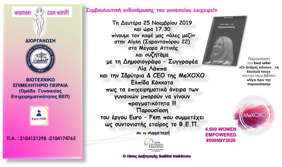 Το Βιοτεχνικό Επιμελητήριο Πειραιά δεν σταματά να στηρίζει την Γυναικεία Επιχειρηματικότητα. Με τον γενικό τίτλο «Women can Win» διοργανώνει στα Μέγαρα την τέταρτη κατά σειρά εκδήλωση. Πρόκειται για μια συνάντηση όπου η γνώση, η εμπειρία και η ενδυνάμωση θα έχουν τον πρώτο λόγο.